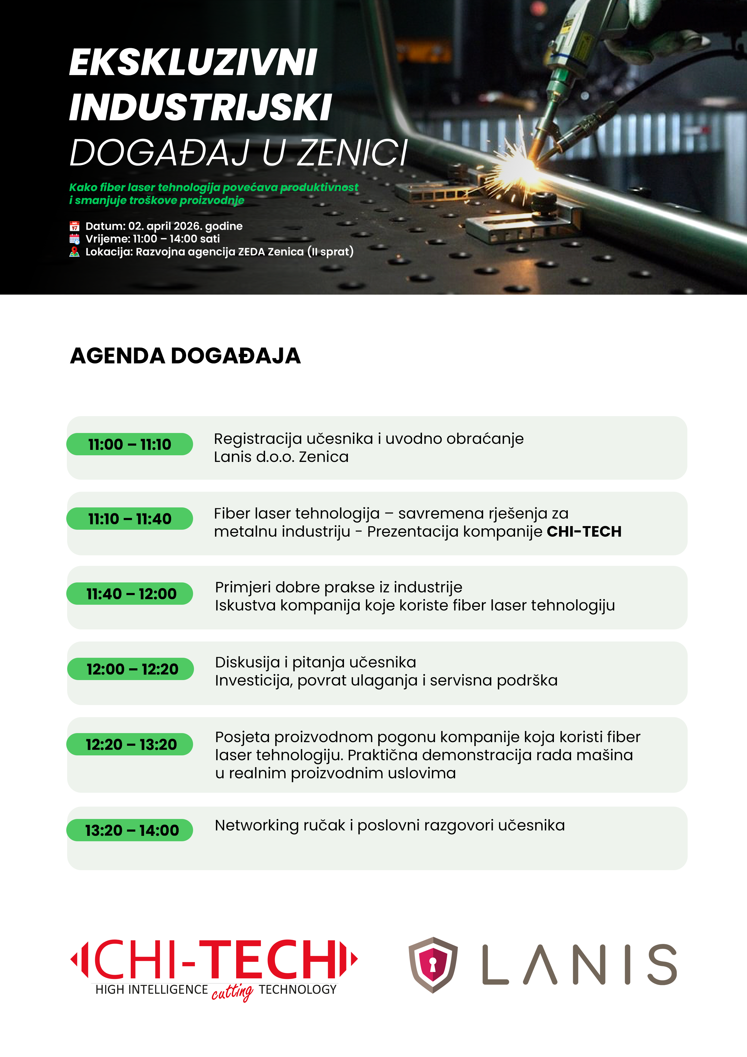 Događaj organizuje preduzeće CHI-TECH – High Intelligence Cutting Technology u saradnji sa preduzećem partnerom iz Bosne i Hercegovine, Lanis d.o.o. Zenica s ciljem predstavljanja savremenih rješenja u oblasti laserskog rezanja metala, automatiziranog i robotiziranog zavarivanja te digitalne transformacije proizvodnje.